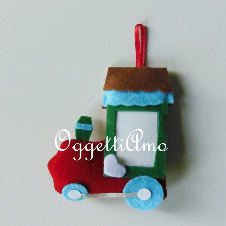 Trenini in feltro per decorare l'albero di Natale con la foto del vostro bambino